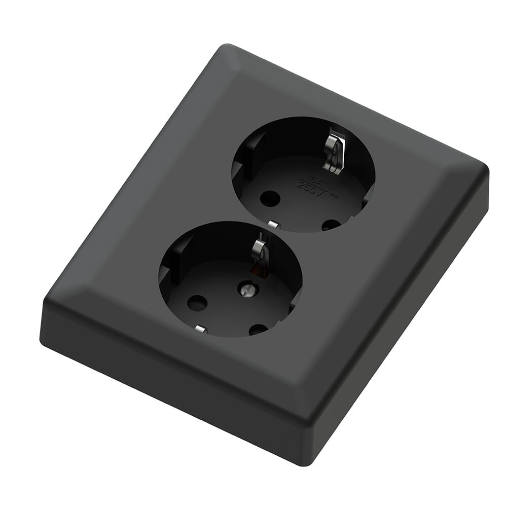 Lavtbyggende innfelt sort dobbel stikkontakt 16A m/ jord og barnevern.