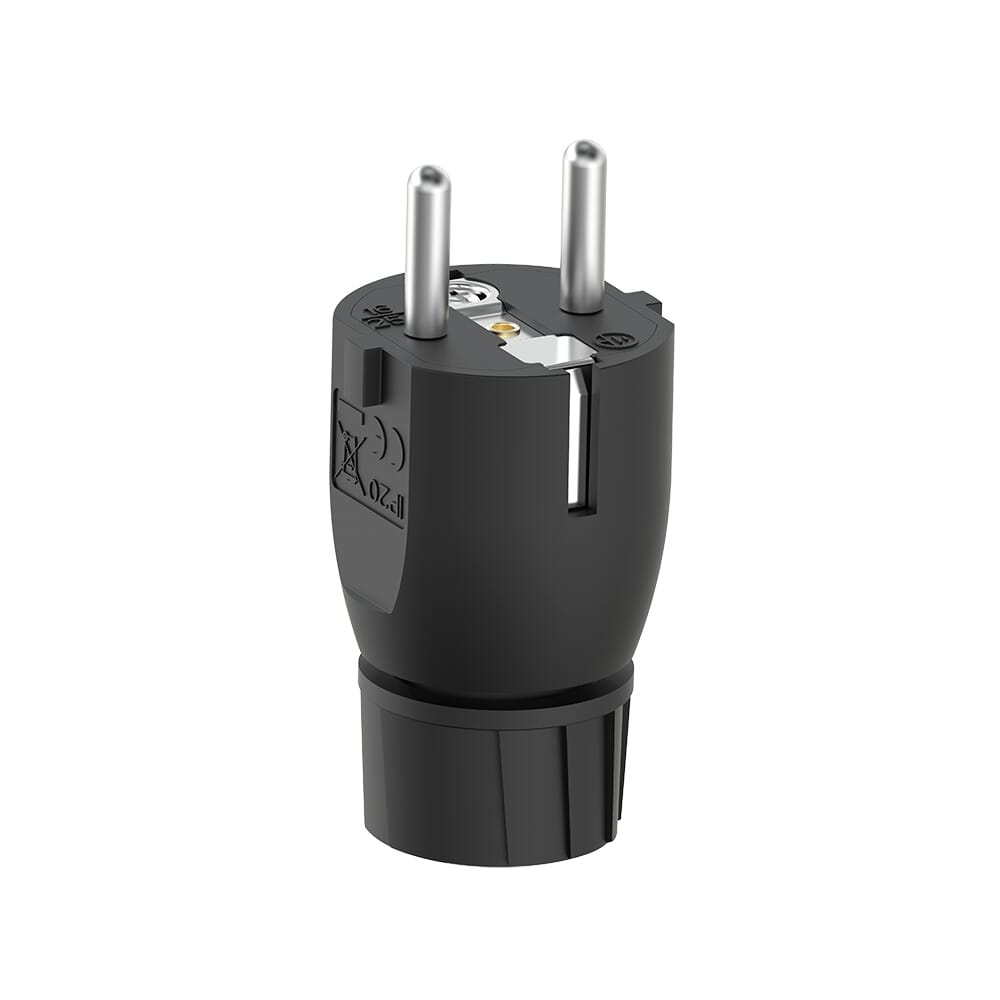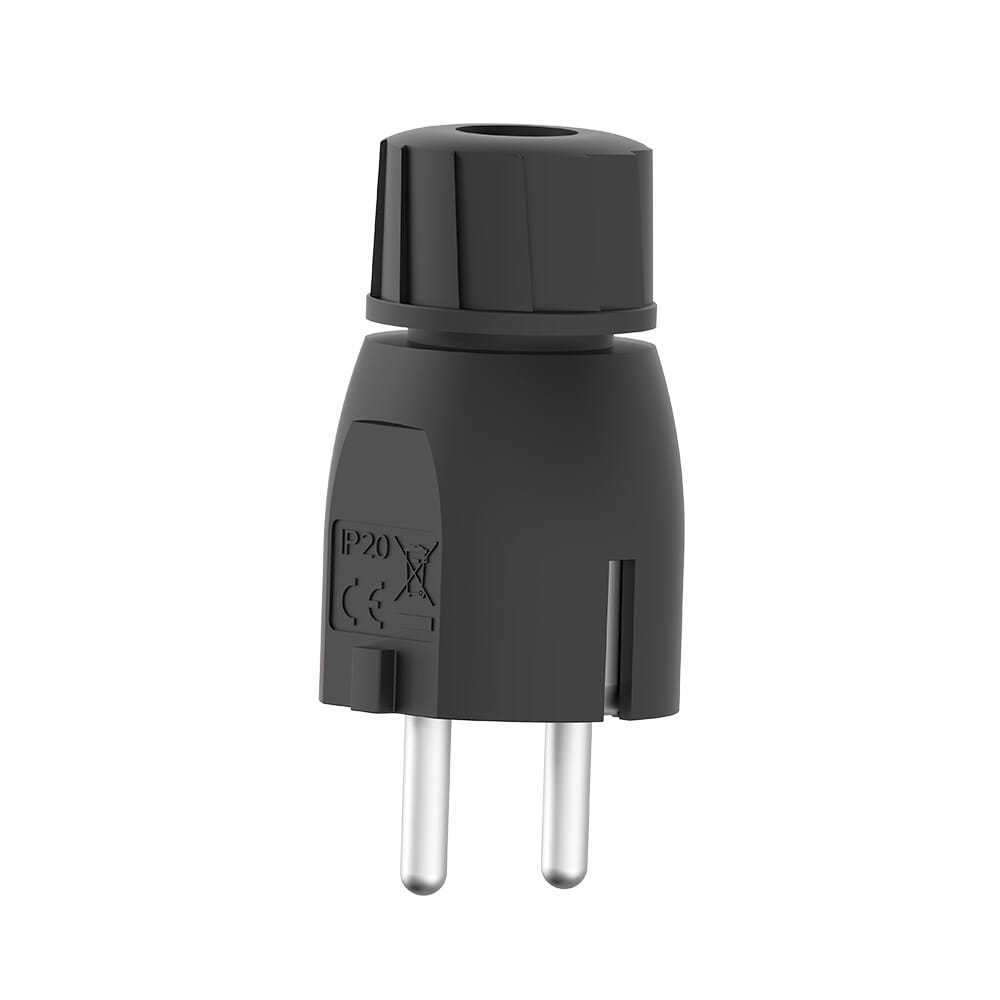 Solid støpsel med rett innføring. Innebygget strekkavlaster. Farge: Sort.